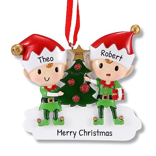 Title: Ornaments by Elves – Personalized Santa’s Elves Family of 2 Christmas Ornaments 2023 – Cute Brothers and Sisters Together Decorating Christmas Tree Hanging Decor in a Giftable Packaging